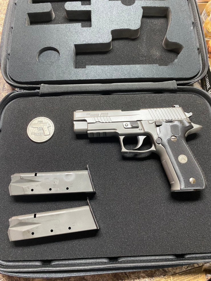 UNFIRED SIG SAUER P226 LEGION, 4.4”, NIGHT SIGHTS, DECOCKER, TWO 15RD MAGS, GRAY, SA/DA, LEGION CASE AND CHALLENGE COIN, BEAUTIFUL  $989