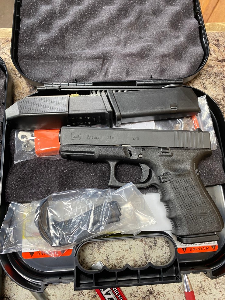 NEW GLOCK 19 GEN 4 9MM, 4”, THREE 15RD MAGS, GRIP SWELLS, CASE $550Â
