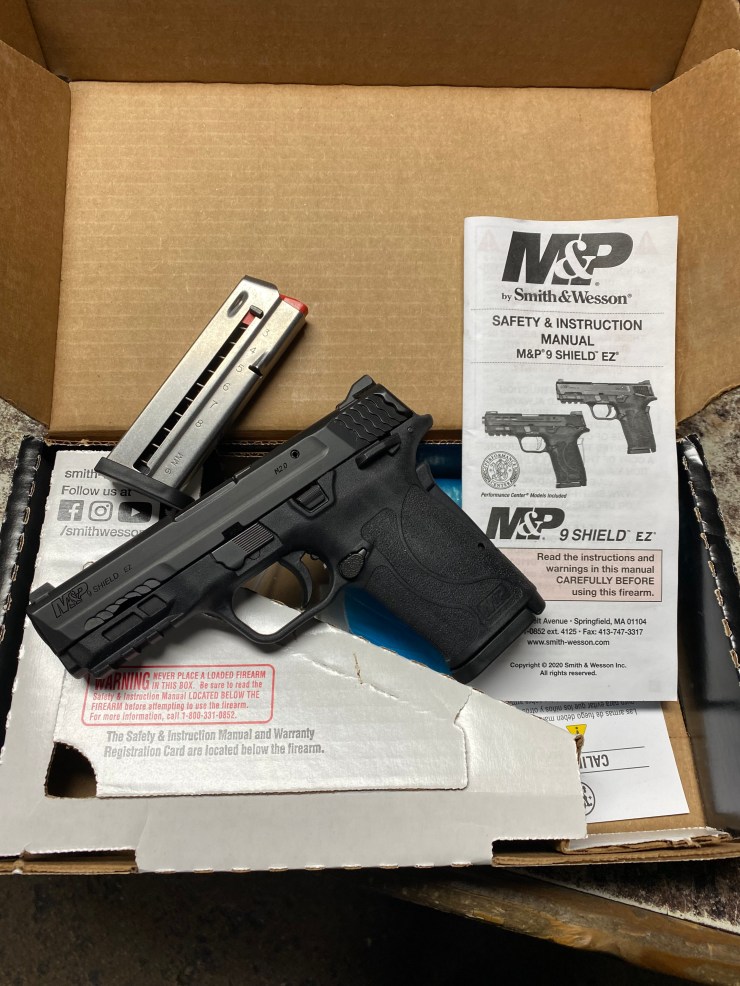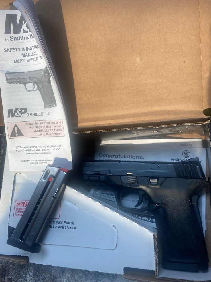 USED EXCELLENT CONDITION S&W M&P9 SHIELD EZ 9 MM, 3.7”, TWO 8 RD MAGS, ORIGINAL BOX AND MANUAL $389