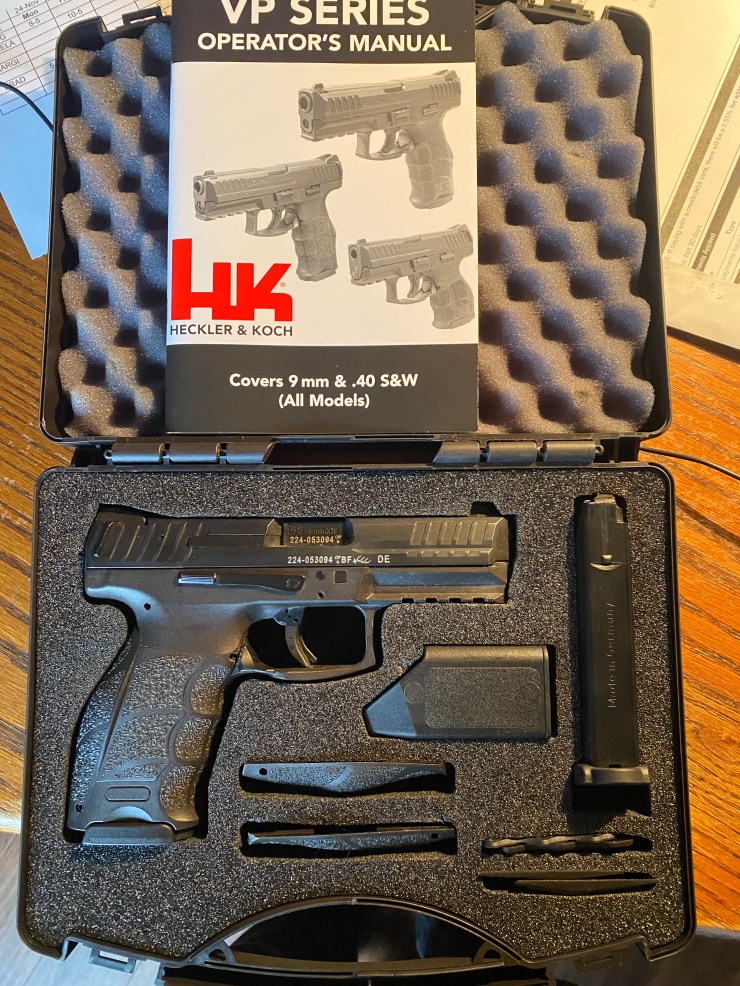 USED HK VP9 9MM, 4.1” BARREL, TWO 15RD MAGS, SPEED LOADER, GRIP SWELLS, AMBIDEXTROUS MAG RELEASE, NIGHT SIGHTS, CASE AND MANUAL, EXCELLENT CONDITION $500